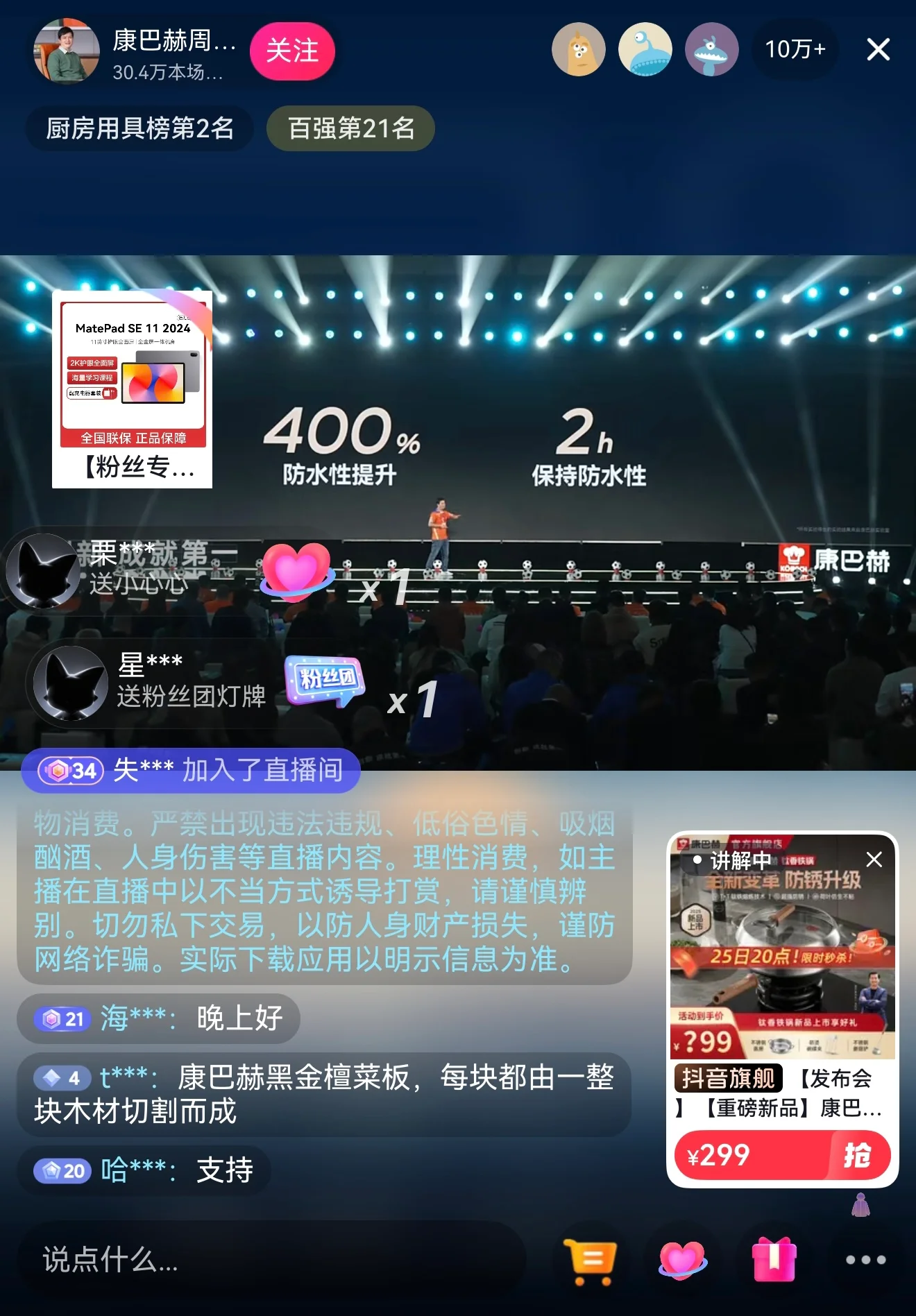 本次发布会在传播广度与市场接受度方面均创下行业新纪录。除主会场“康巴赫周和平”直播间10分钟突破10万+的亮眼数据外,京东与天猫官方直播间观看人数也分别达到63万与48万,形成了全域覆盖的传播矩阵,展现出公众对健康厨具技术革新的高度期待。